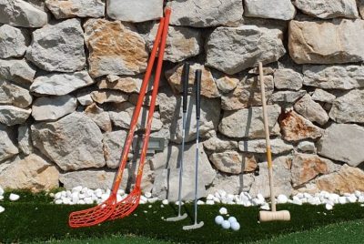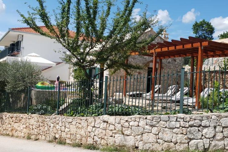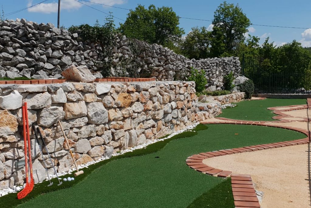 Okućnica se sastoji od konobe s kominom i kuhinjom. U dvorištu se nalazi još i bazen s ležaljkama i tušem, prostorom za sjedenje i terenom za mini golf sa 4 staze i 12 rupa.